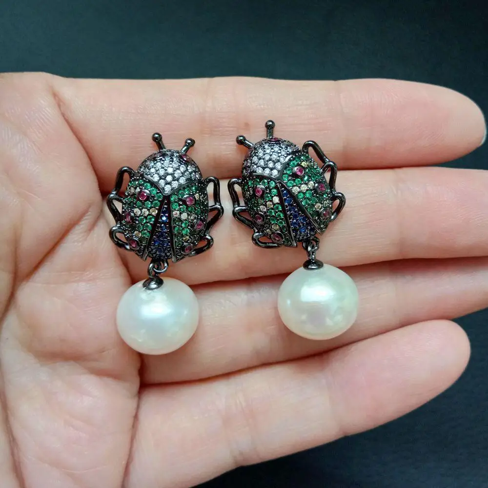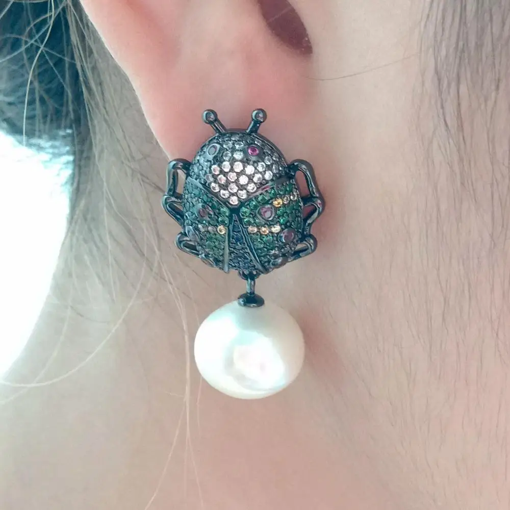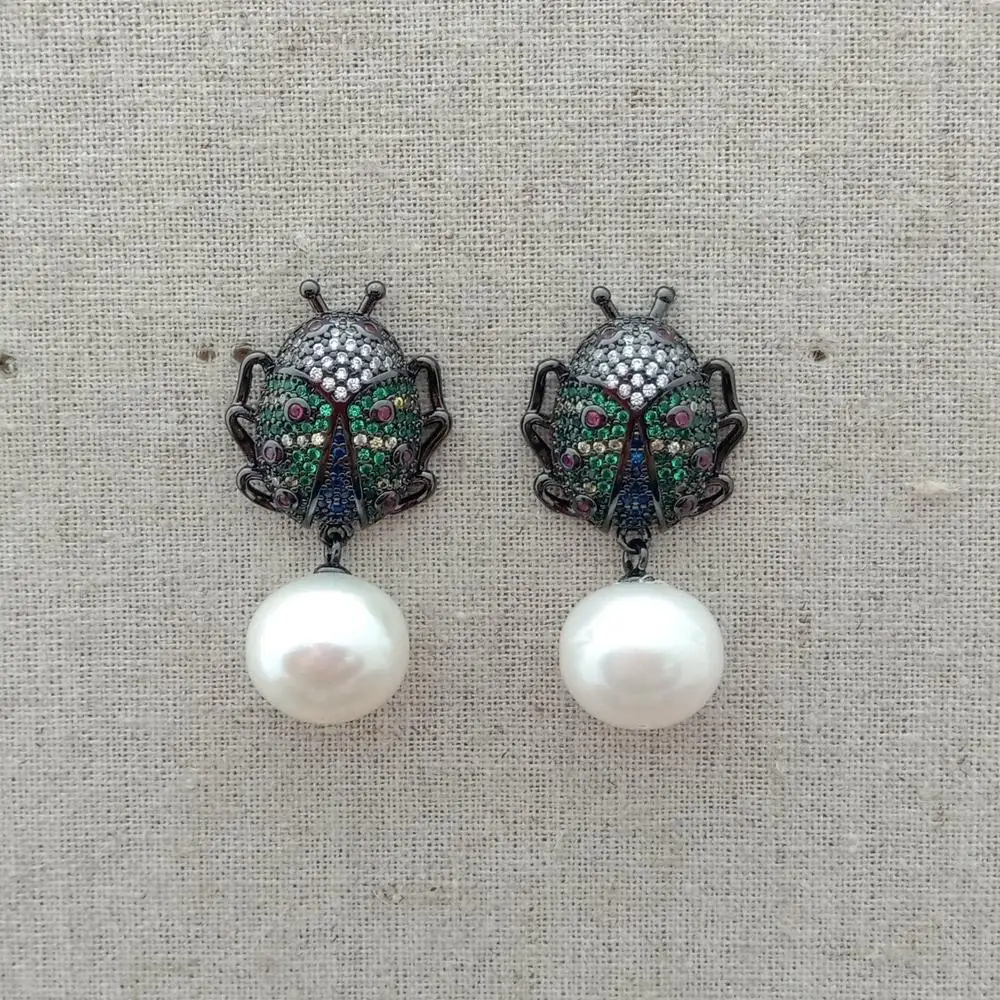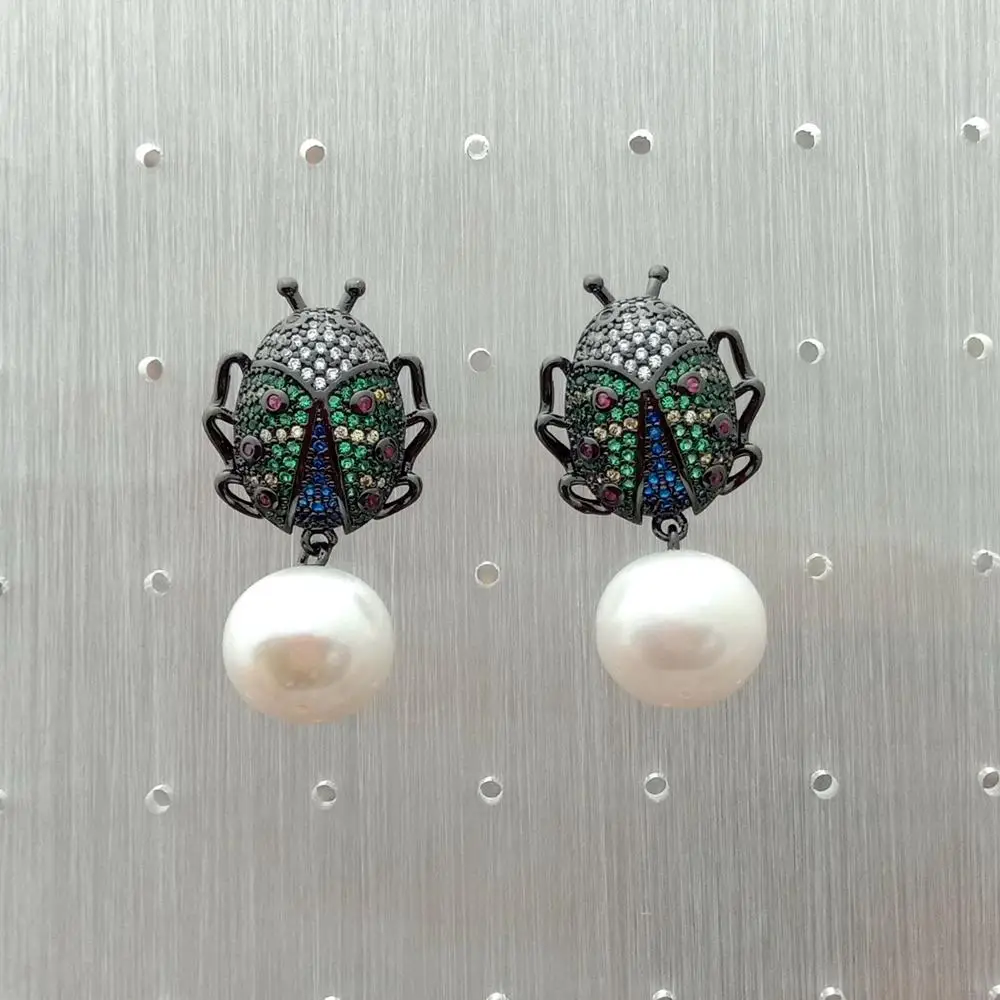 10x12mm White freshwater Pearl gunmetal color plated cubic zirconia micro pave Beetle Earrings animal earrings for women