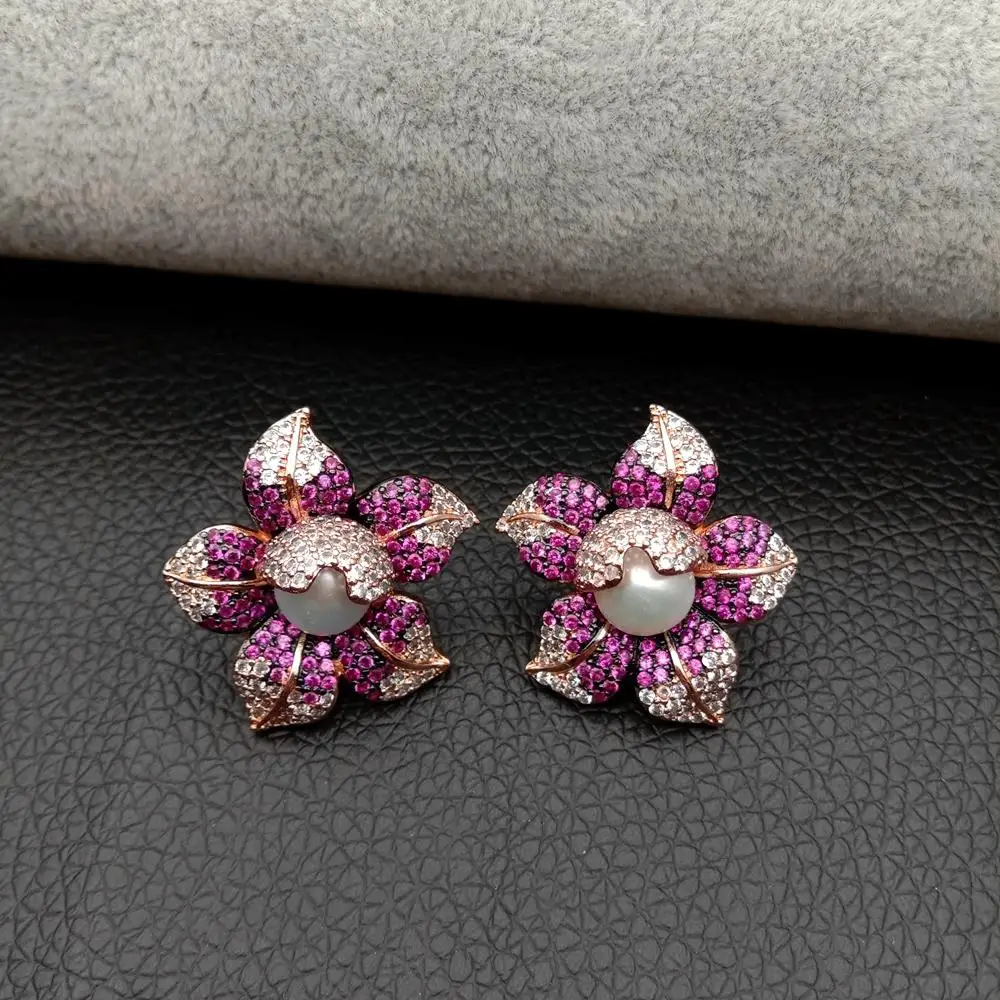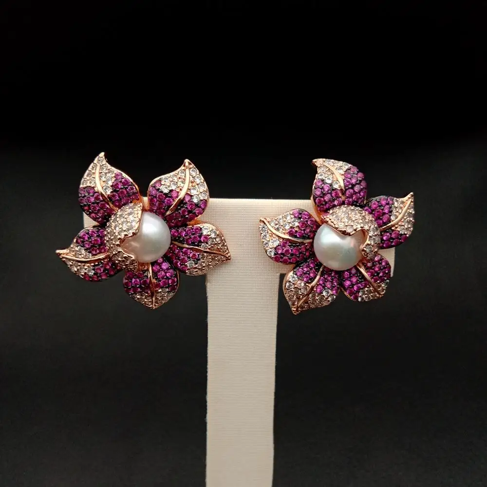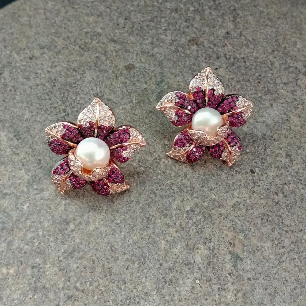 Gems Info: Fresh water cultured pearl. white pearl. Rose Gold Plated Cz Flower Stud Earrings. good quality. high luster!