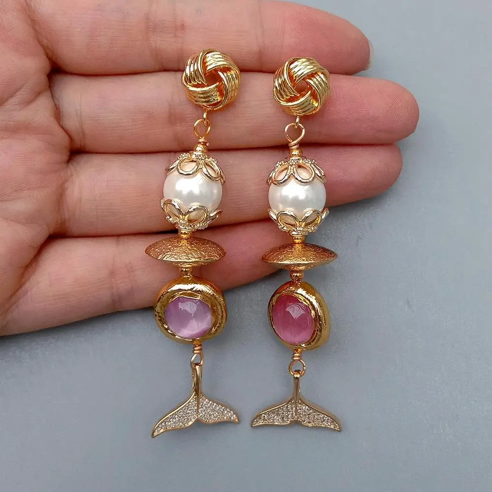 Gems Info: white sea shell pearl. pink cat eye with gold plated edge. cz pave fish tail fitting. good quality. high luster!