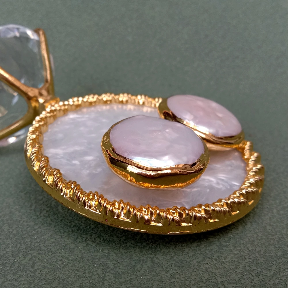 16mm Freshwater White Coin Pearl 24 K Gold Plated Stud Green Cz Earrings