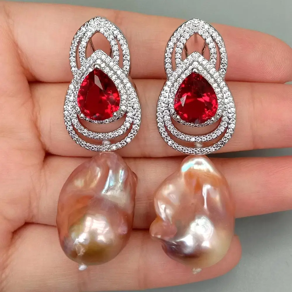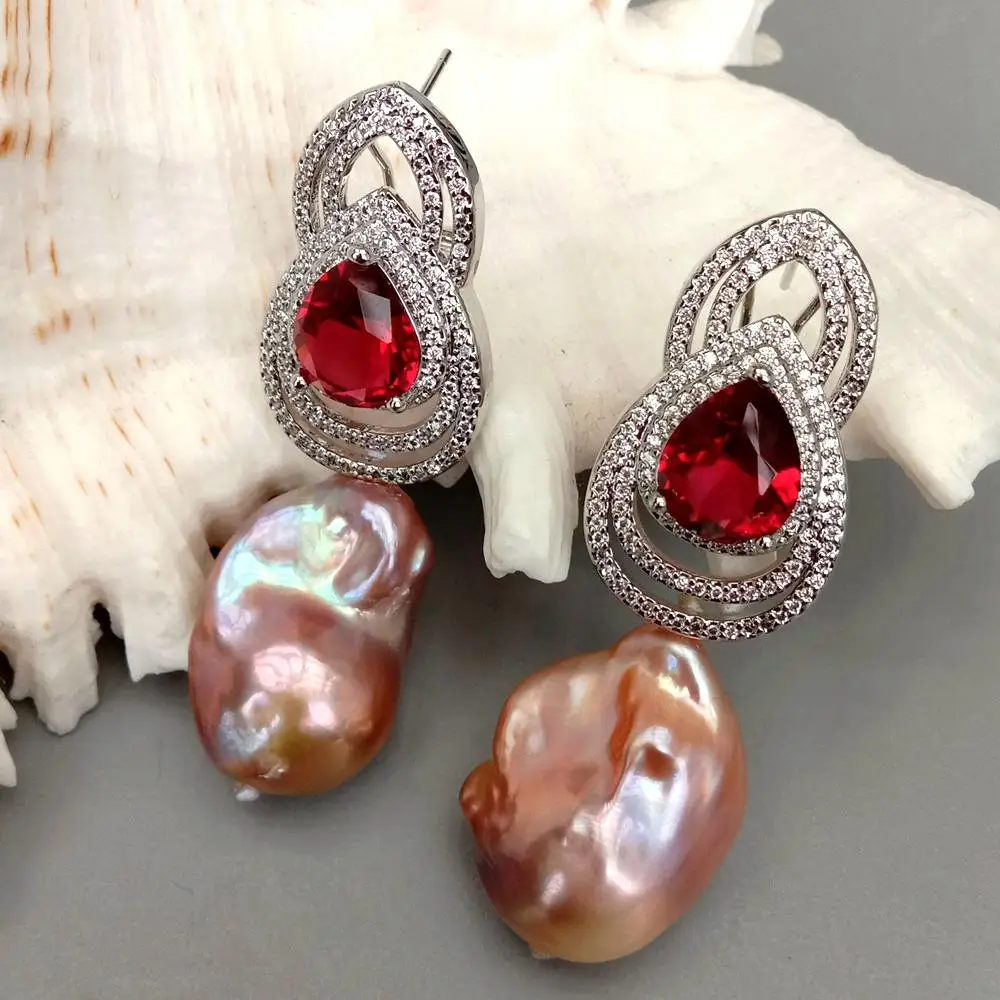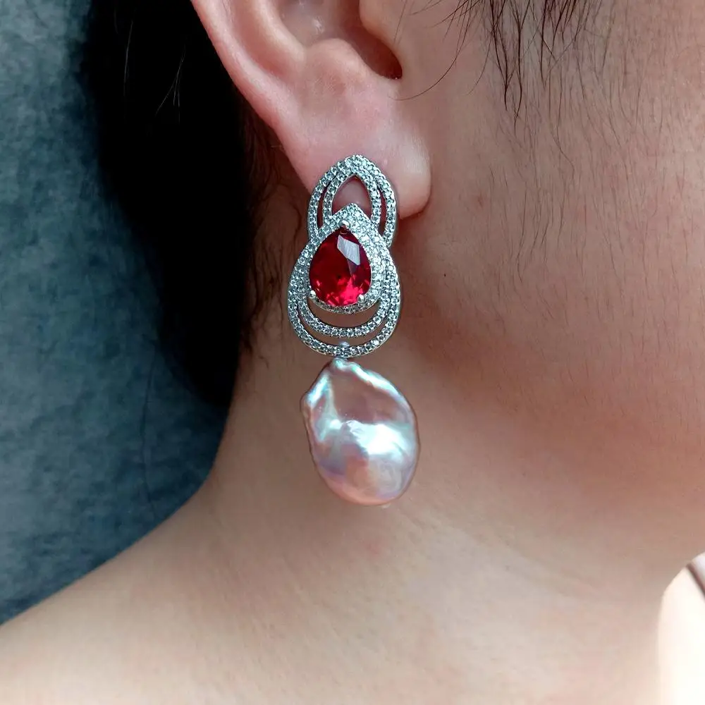 Gems Info: cultured pearl. white keshi pearl. Red and clear cubic zirconia.