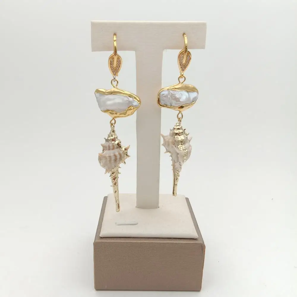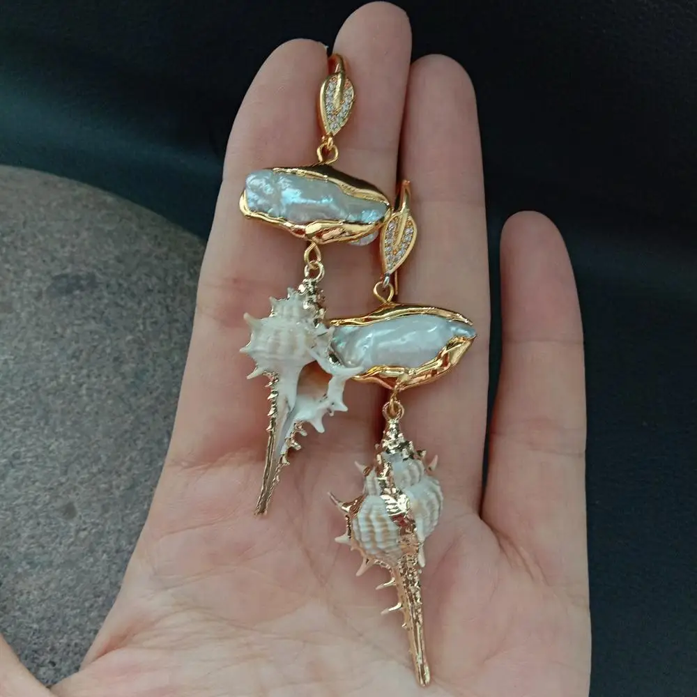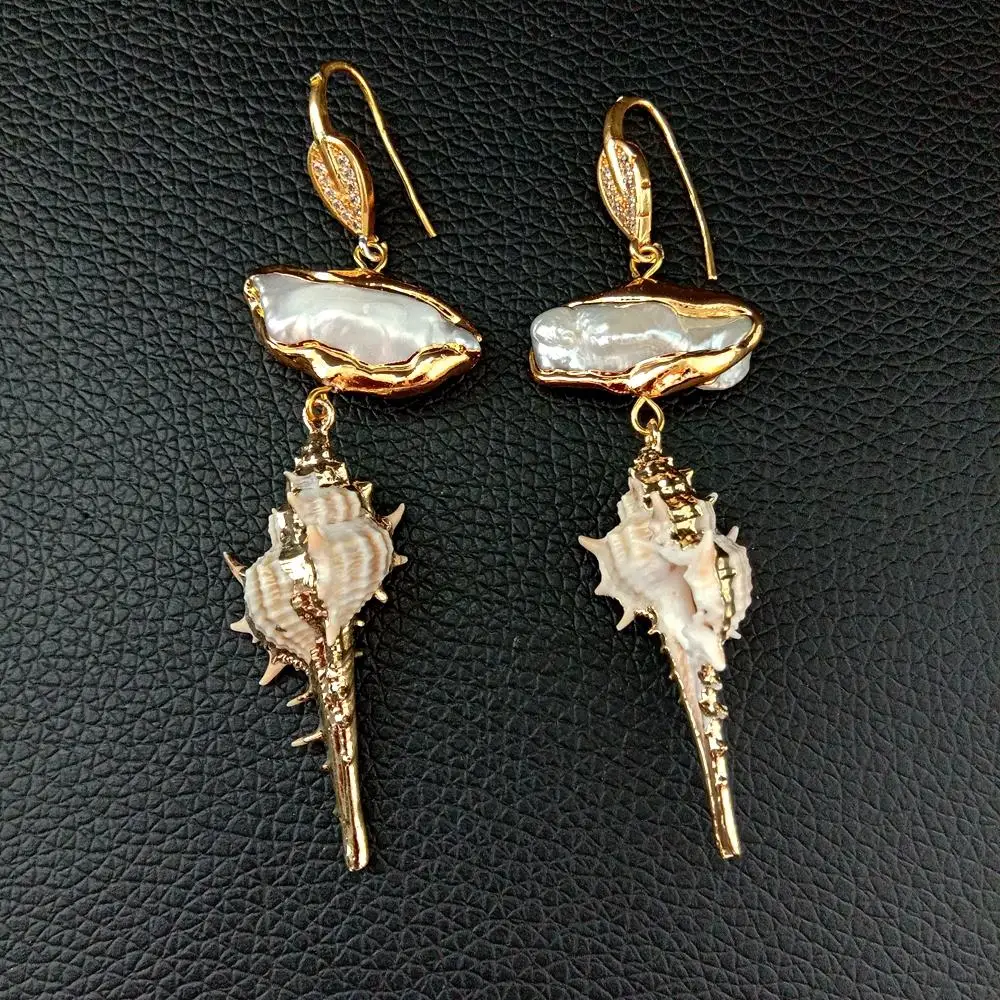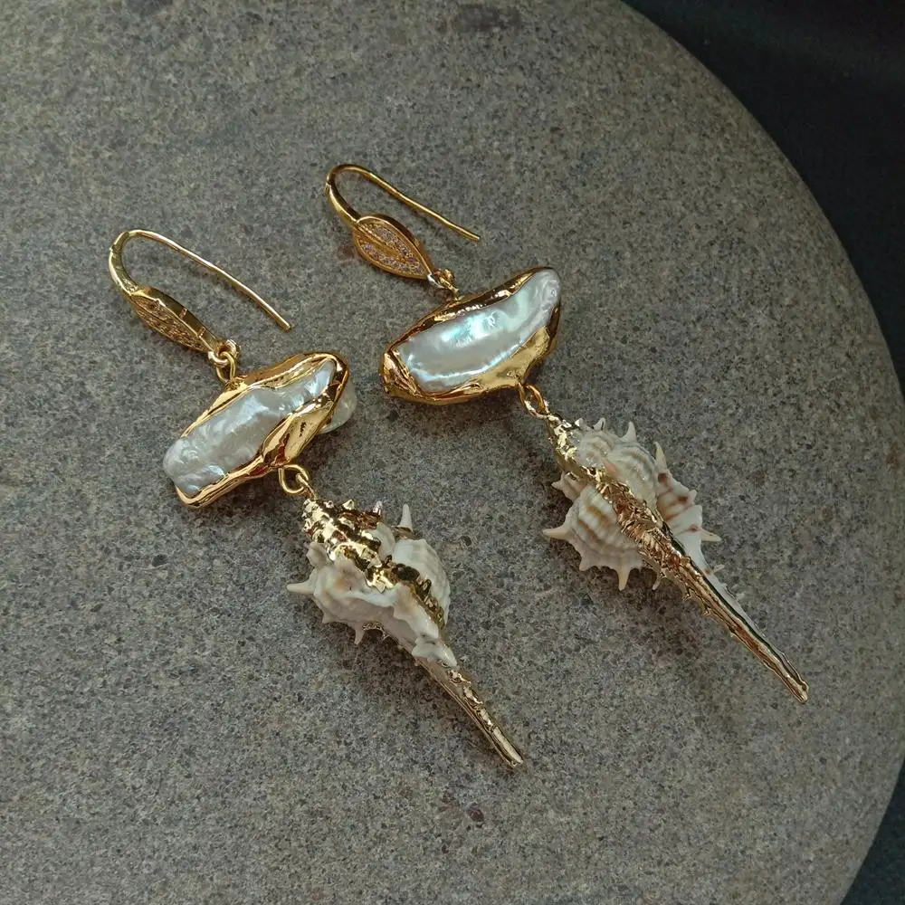 Yellow gold color Plated White Biwa Pearl Sea Snail shell drop dangle Earrings punk style for women